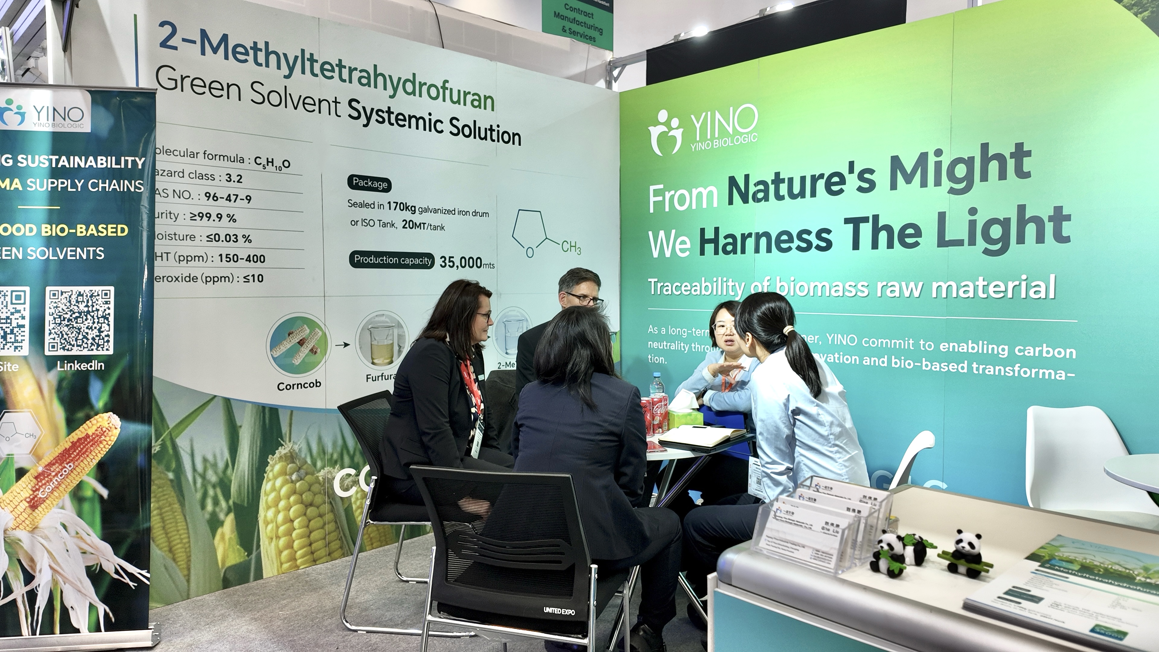 在制藥生產(chǎn)中,溶劑與原料的選擇不僅關系到工藝的安全性與環(huán)境友好性,更直接影響藥物純度和生產(chǎn)效率。YINO Biologic 以非糧生物質玉米芯為原料,從源頭實現(xiàn)碳減排與資源高效利用,構建了覆蓋從原料到終端制造的綠色供應鏈。本次展會上,公司重點展示了多款高性能可持續(xù)產(chǎn)品,包括可作為活性藥物成分(API)合成綠色溶劑的 2-Methyltetrahydrofuran(2-MeTHF),該產(chǎn)品可有效替代傳統(tǒng) THF,顯著降低揮發(fā)性有機物排放并提升反應安全性與效率;用于高端藥物保護基及精細化工中間體合成的關鍵原料 3,4-Dihydro-2H-Pyran(DHP);以及新一代高純度環(huán)狀酯原料 δ-Valerolactone(δ-VL),廣泛應用于藥物輔料及聚合物開發(fā)領域,充分展現(xiàn)了 YINO 在綠色化學與可持續(xù)材料創(chuàng)新方面的實力。